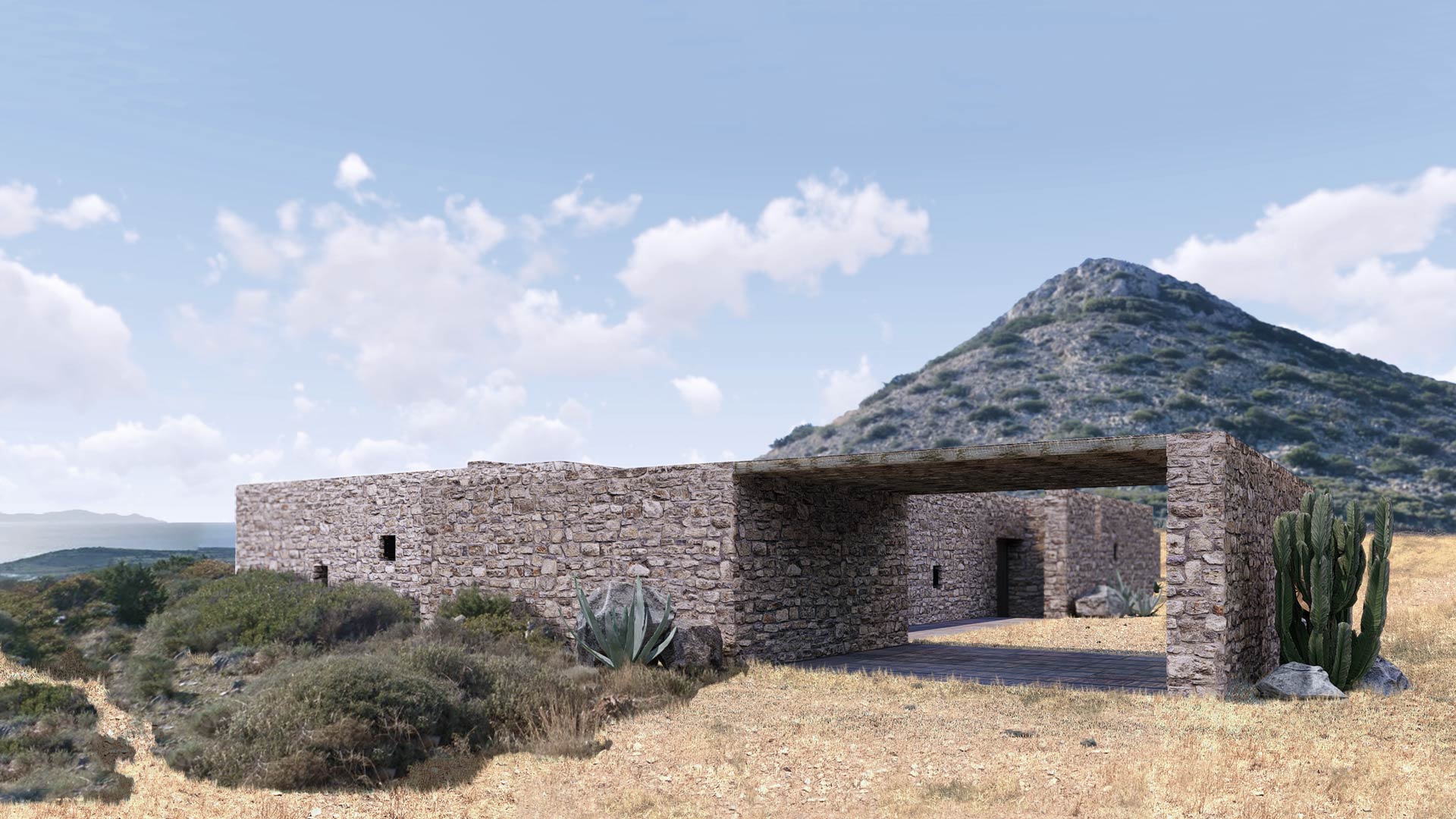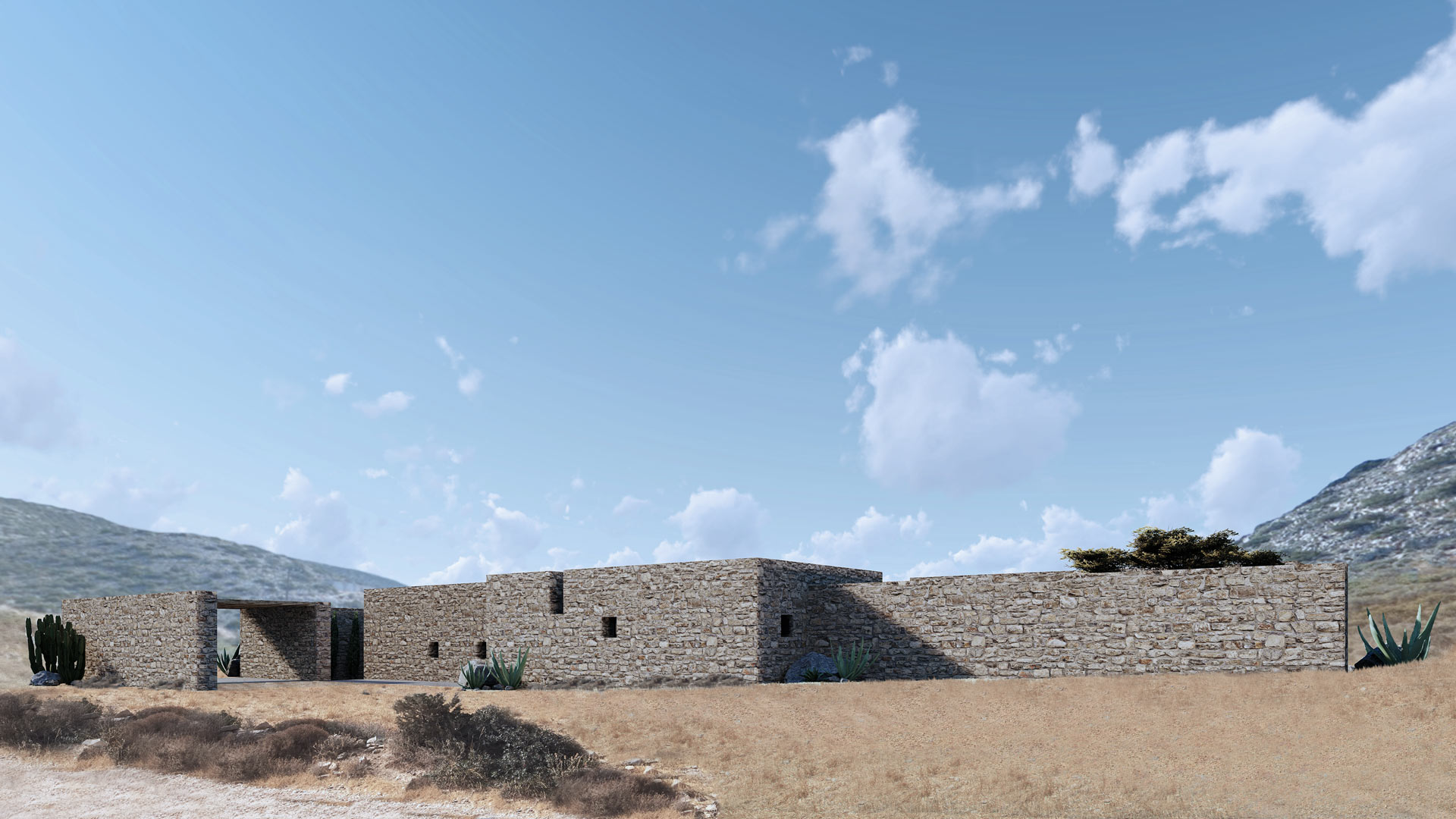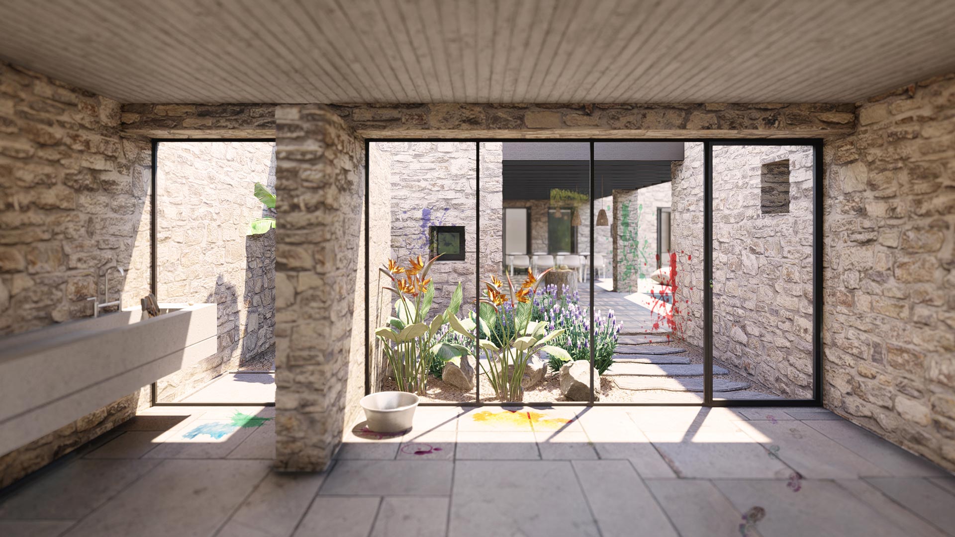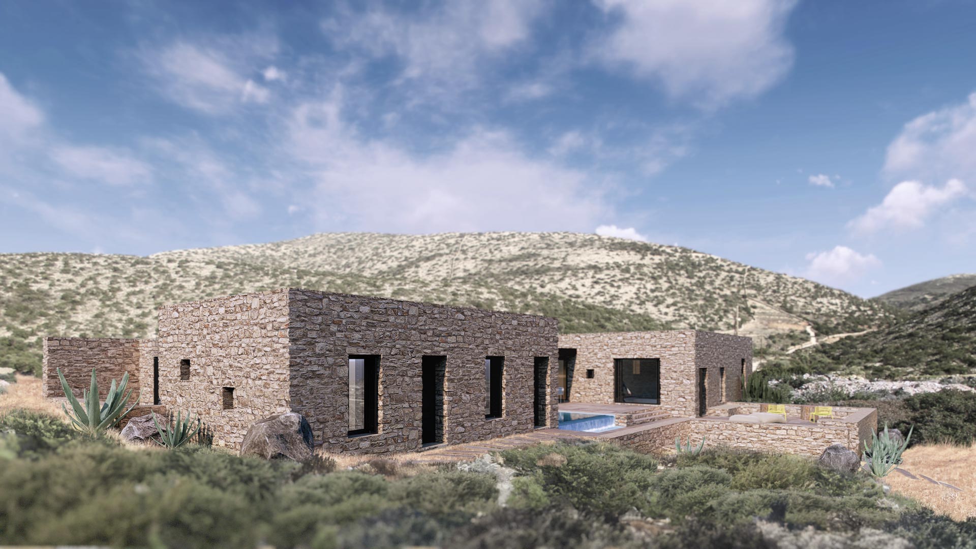 El cliente del proyecto era una pintora con ganas de centralizar su vida social, profesional y privada en una vivienda aislada con vistas espectaculares. La piedra natural se integra perfectamente en el terreno, ofreciendo un remanso de paz donde dejar fluir las musas del arte.