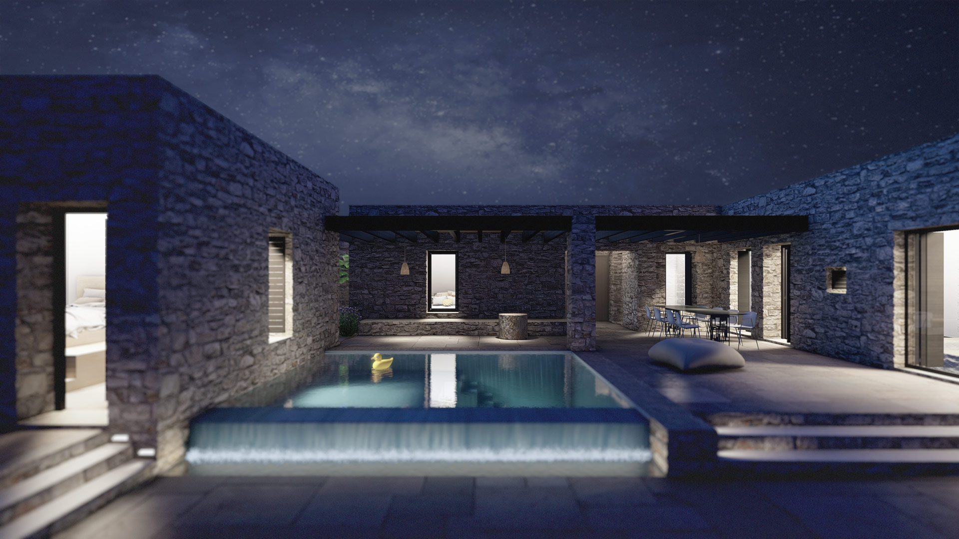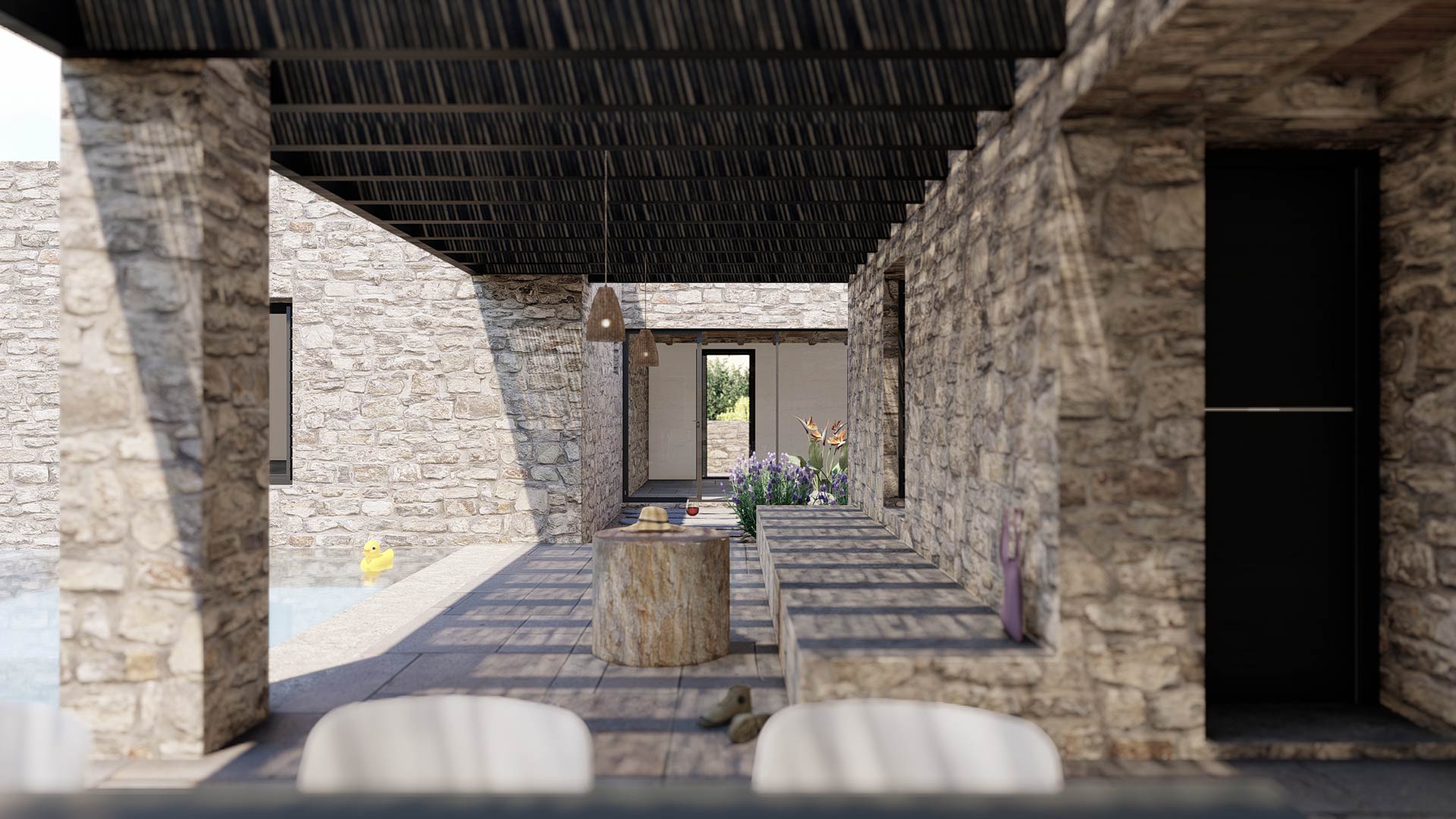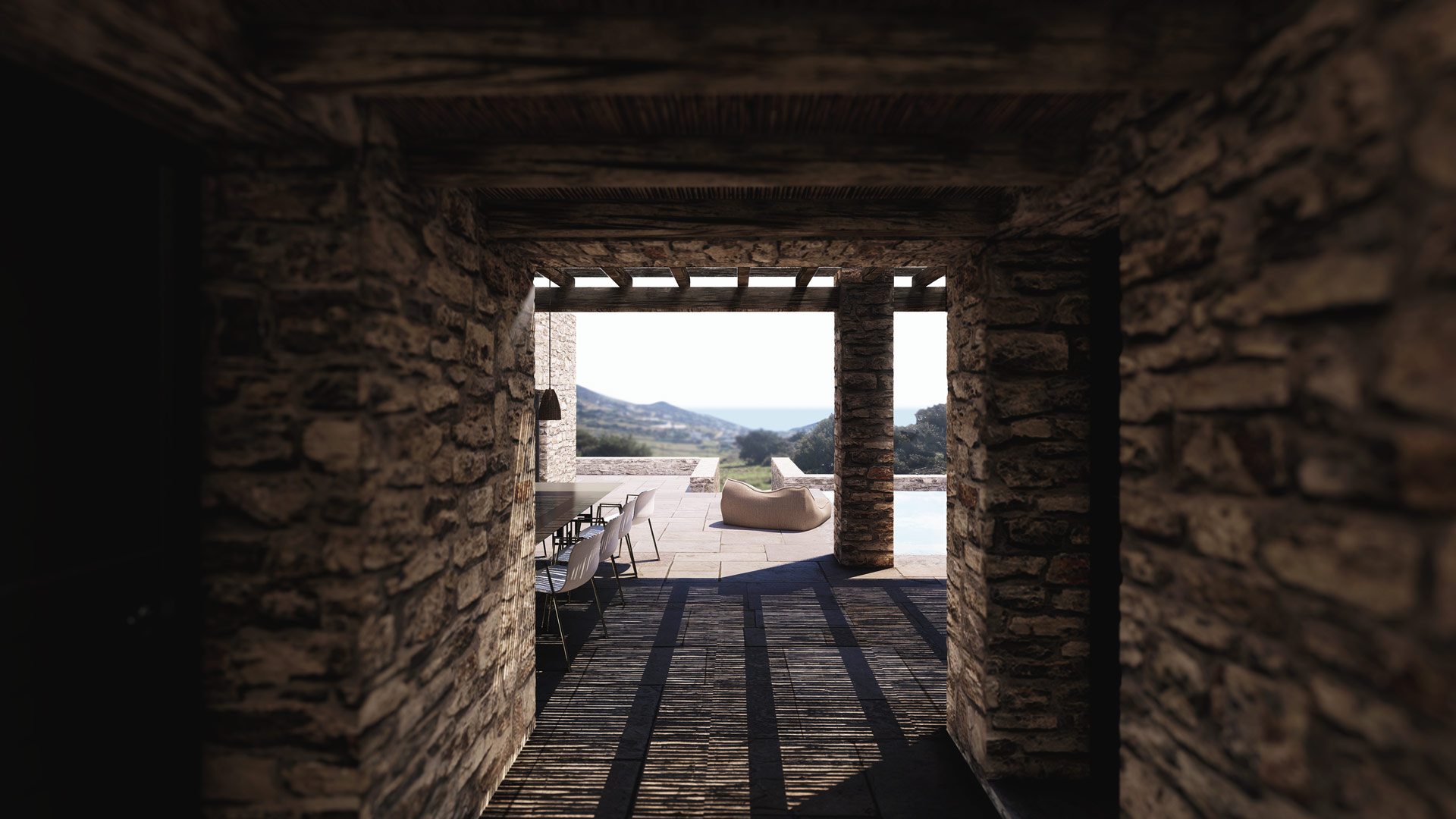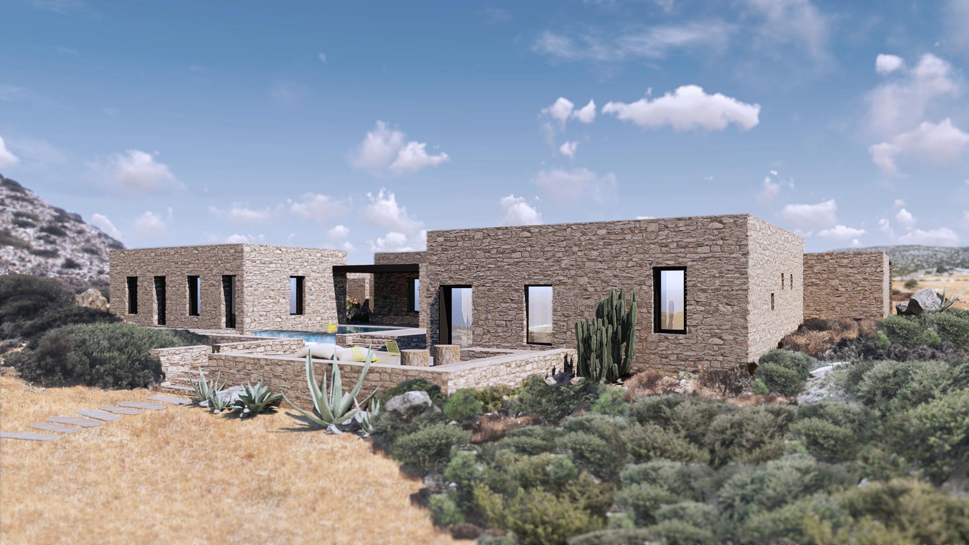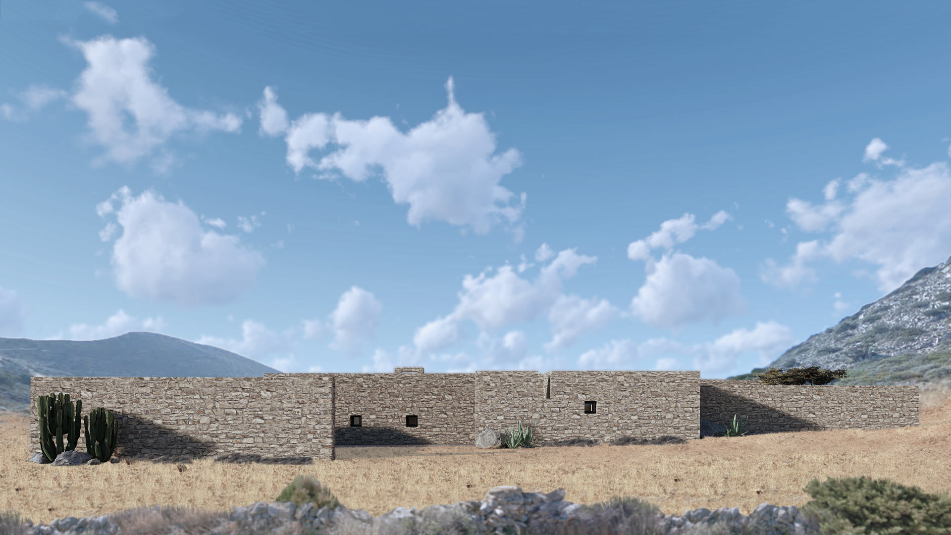El cliente del proyecto era una pintora con ganas de centralizar su vida social, profesional y privada en una vivienda aislada con vistas espectaculares. La piedra natural se integra perfectamente en el terreno, ofreciendo un remanso de paz donde dejar fluir las musas del arte.