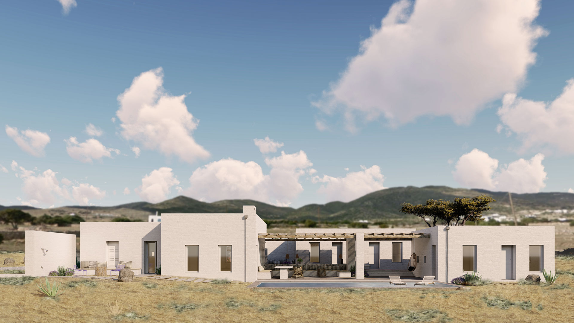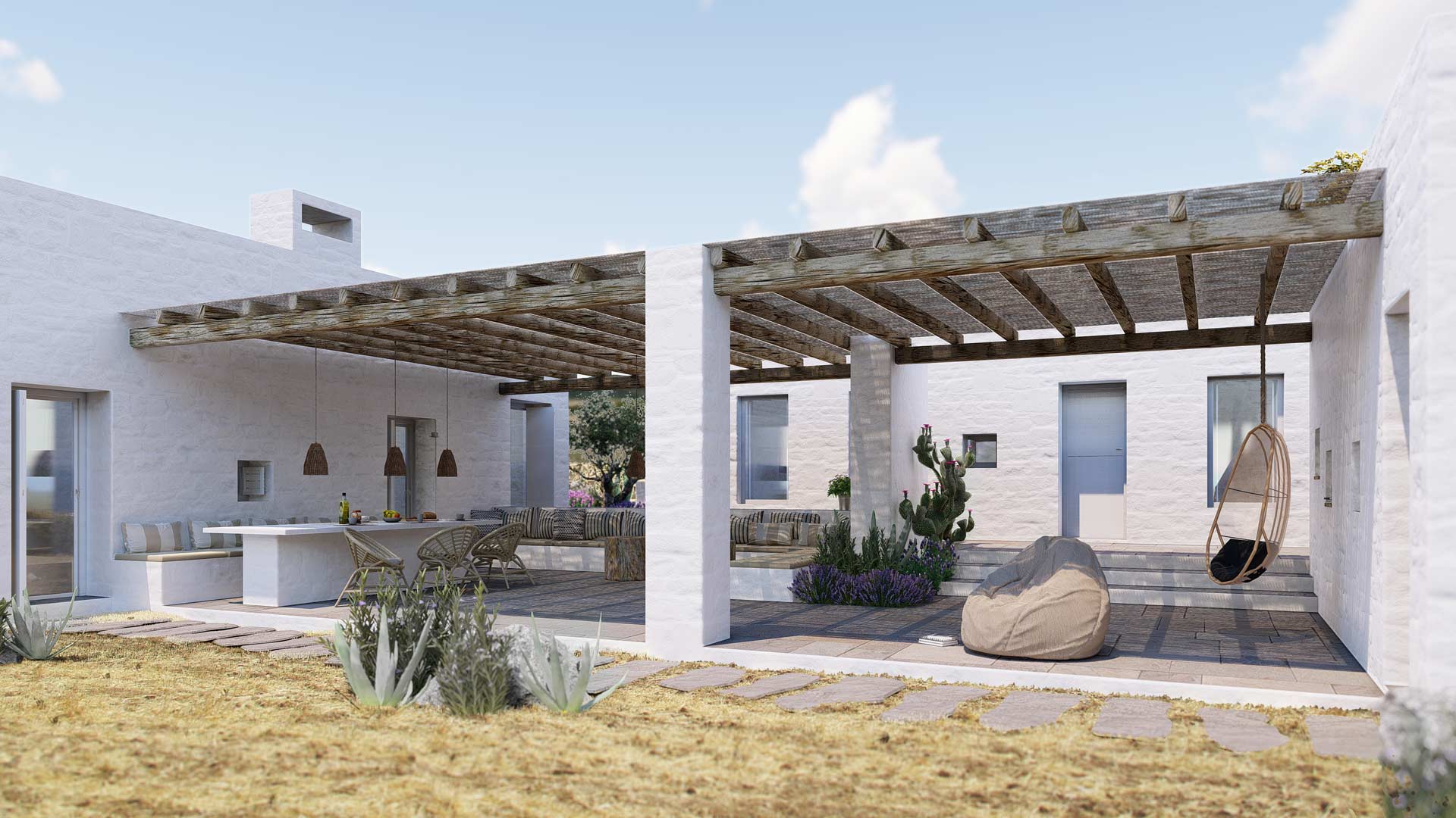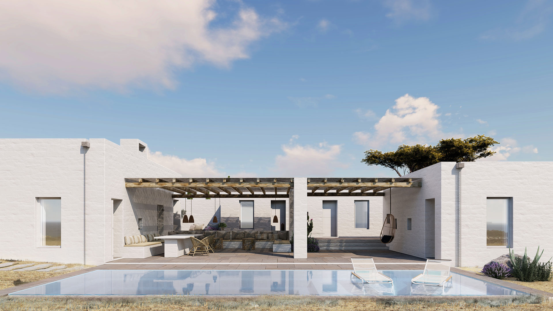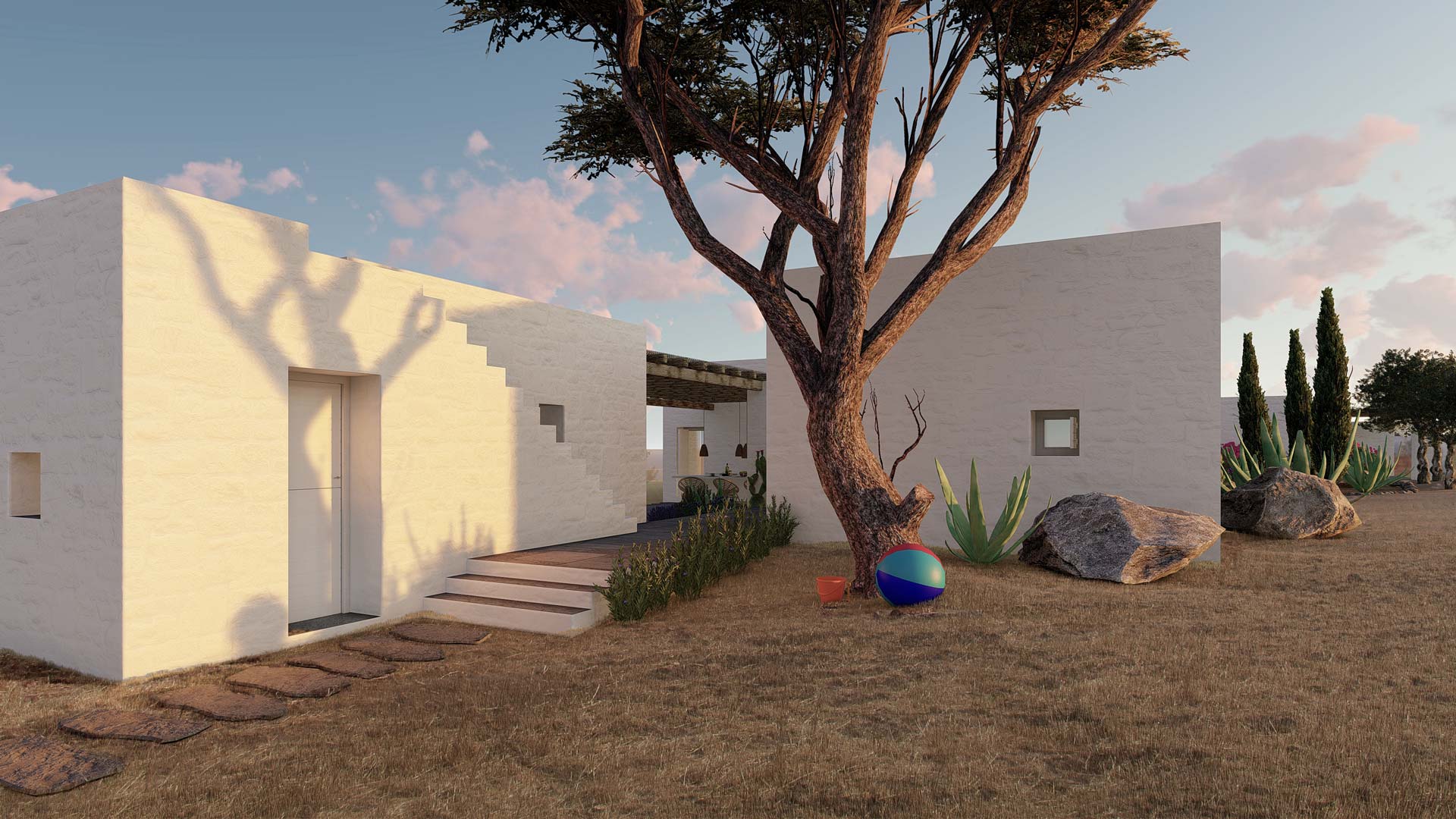 Proyecto griego por antonomasia, consta de 3 volúmenes que recogen las zonas de salón-comedor-cocina, habitaciones y estancias de invitados, articulado todo alrededor de un patio pergolado.