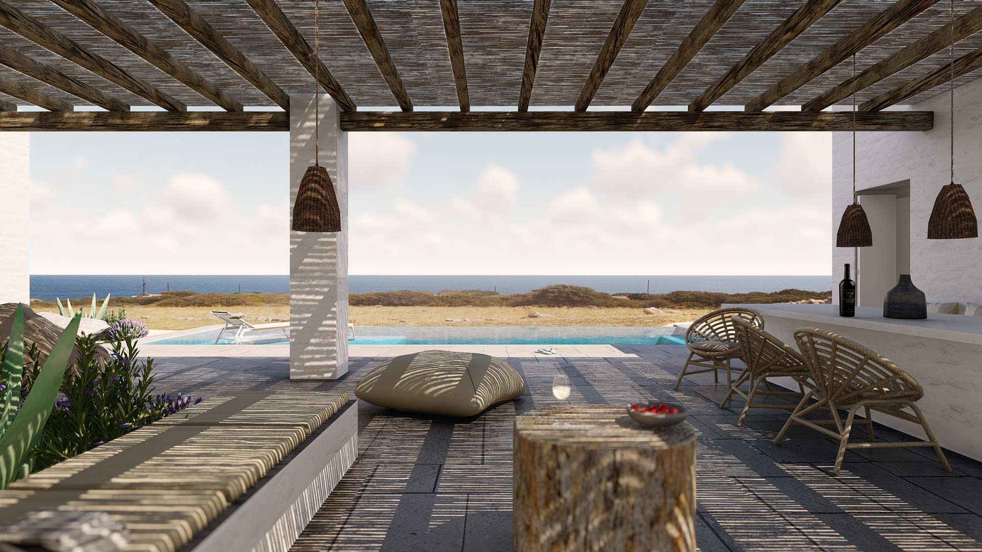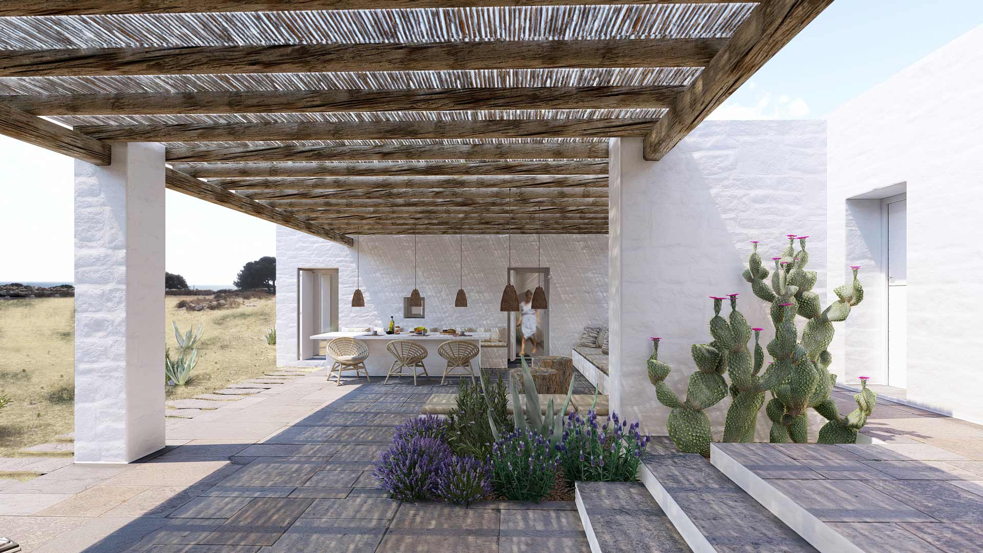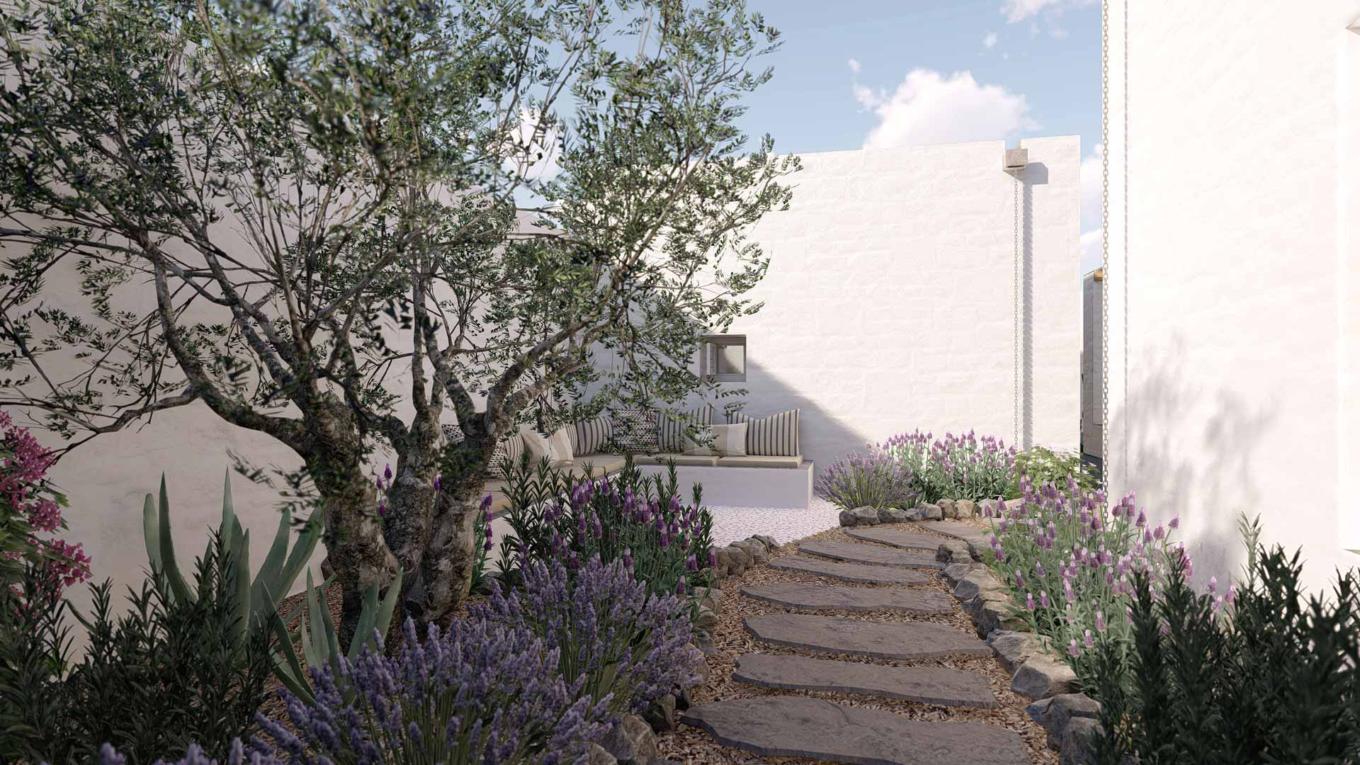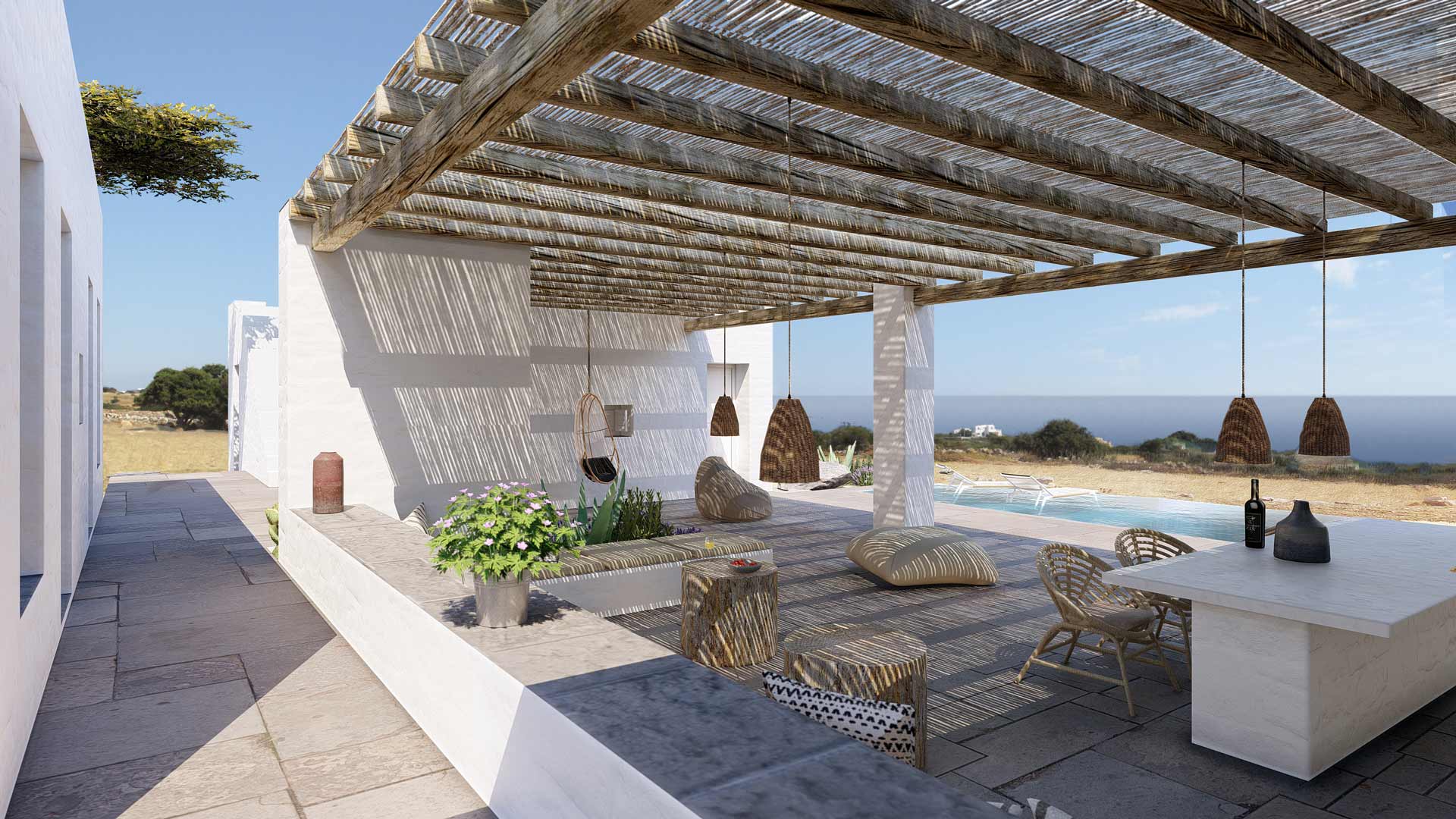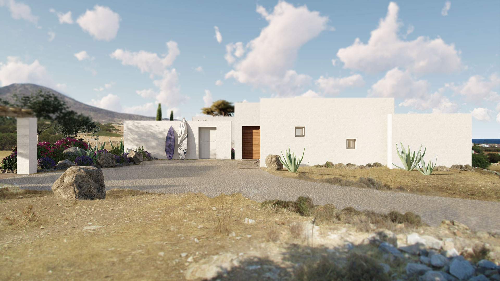 Ubicado en un terreno plano con vistas al mar, como buena villa griega vacacional la vida va a llevarse a cabo en ese espacio común. Trabajamos desde la materialidad, con muros encalados de piedra natural, suelos de grandes losas grises y pérgolas con madera envejecida tratada. Las carpinterías se mantuvieron blancas también, para resaltar la vegetación como único punto de color. El jardín de entrada se planteó como un rincón sensorial donde relajarse, con un banco corrido y hierbas aromáticas de bajo mantenimiento.